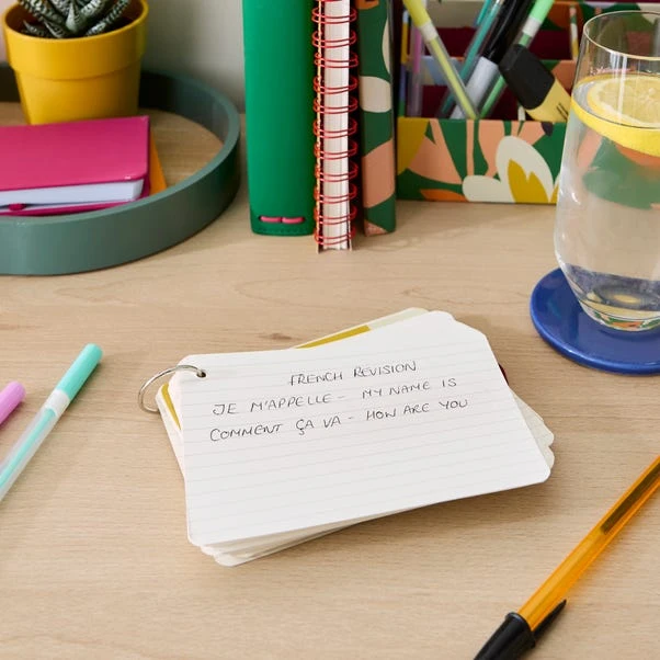 The Elements Sutton Stripe Revision Cards are designed for effective study and note-taking. This flash card pad is made from high-quality, thick FSC paper with ruled lines, ensuring a smooth writing experience. It comes with a metal binder ring for easy organization, making it suitable for study notes, work notes, and recipe cards. An elastic band ensures secure closure, keeping your notes neat and protected. Perfect for students and professionals alike, these revision cards combine functionality with style.