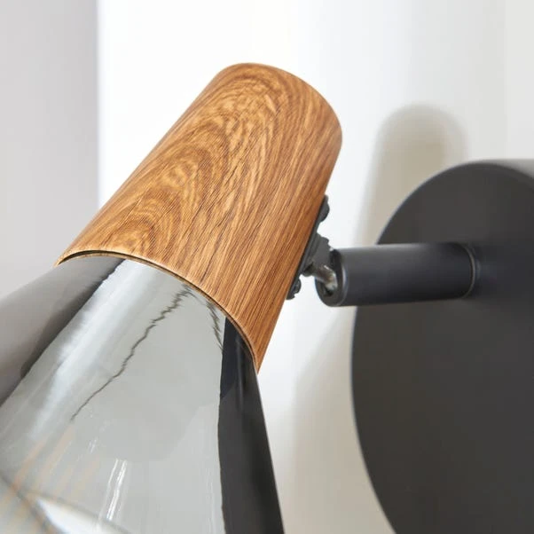 Illuminate your bathroom with the unique Wolston Bathroom Adjustable Wall Light. Featuring a modern design with wood-effect detail on the shade, it adds a touch of sophistication to your space. With an adjustable head and dimmable capabilities, it offers versatility and ambience for your bathroom.